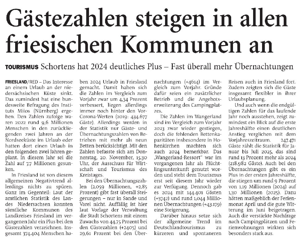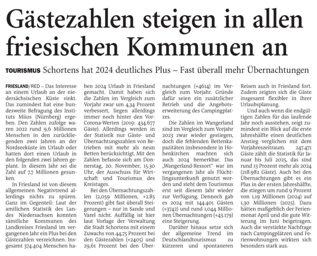 Jeversches Wochenblatt Leute Politik 19.11.2025 Jeversches Wochenblatt – Gästezahlen steigen in allen friesischen Kommunen an 18. November 202518. November 2025 peter Post Views: 2