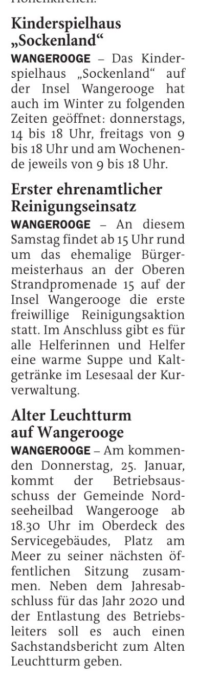 Jeversches Wochenblatt Leute 20.01.2024 Jeversches Wochenblatt – Kinderspielhaus – Erster ehrenamtlicher Reinigungseinsatz – Alter Leuchtturm 19. Januar 202419. Januar 2024 peter Post Views: 451