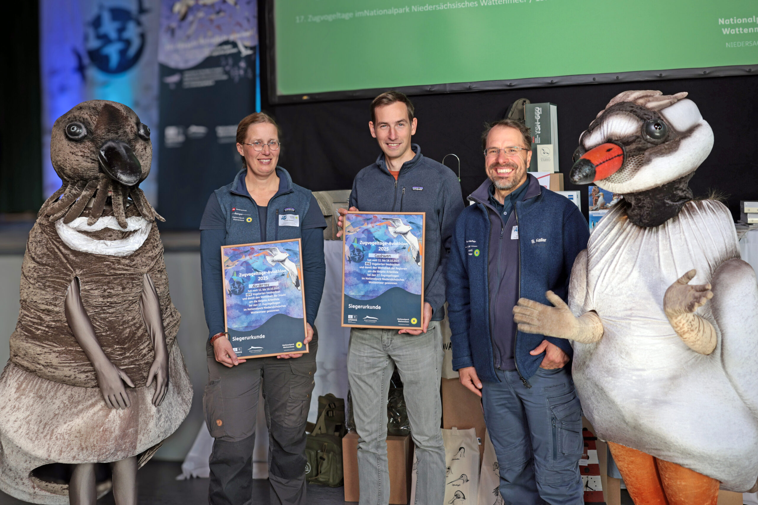 Beim Aviathlon, dem Wettbewerb um die meisten beobachteten Vogelarten, konnten die Teams von Norderney und Cuxhaven die Siegerurkunden entgegen nehmen – überreicht von “Rotti” und “Sandi”.