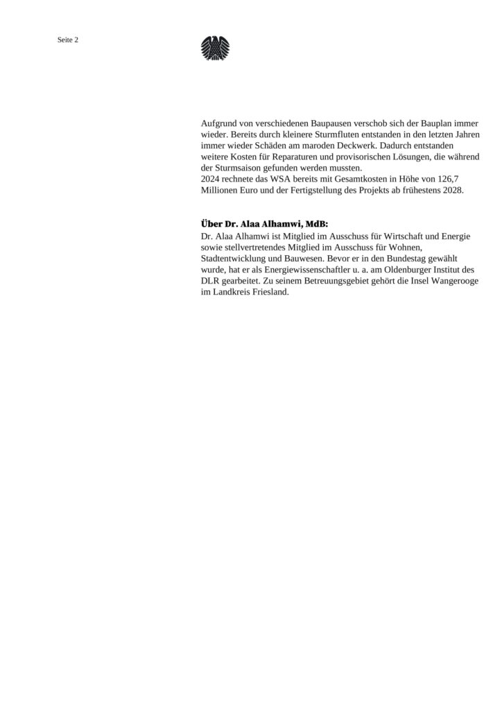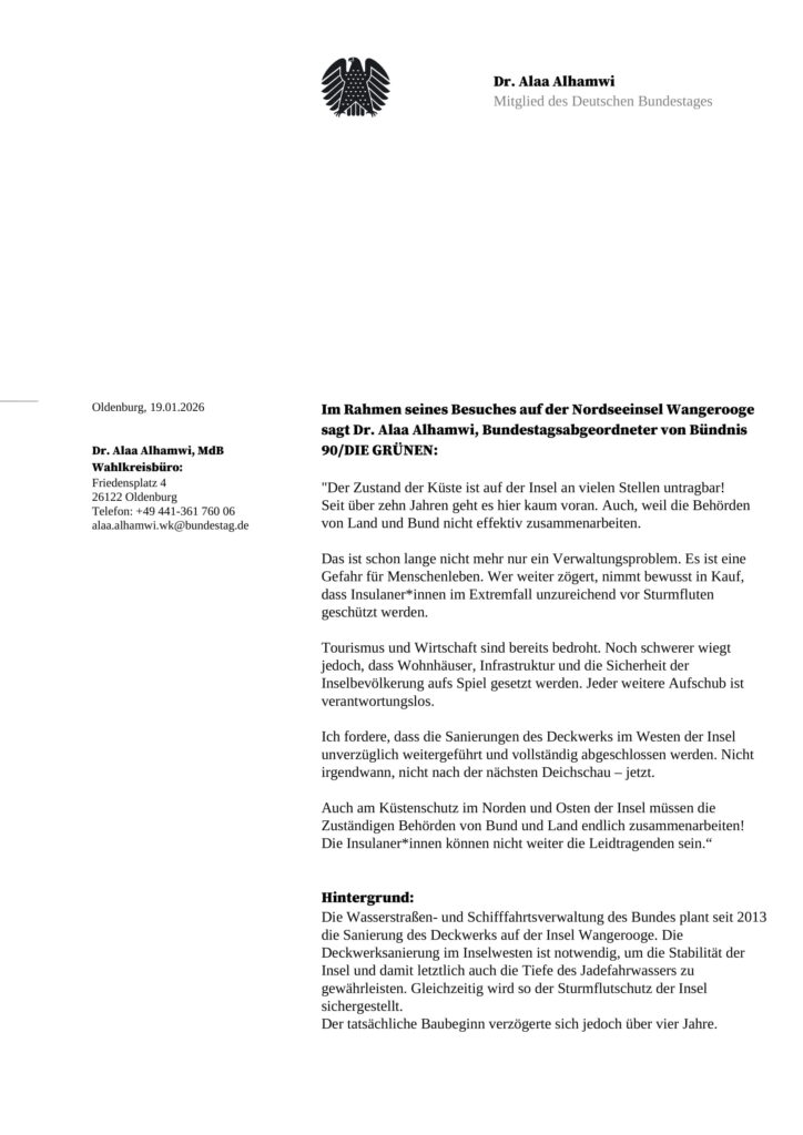 Der Grüne Bundestagsabgeordnete Dr.Alaa Alhamwi (MdB/Bündnis90/Die Grünen) hat am Sonntag, den 18.01.2026 auf Einladung des Wangerooger Grünen Ratsherren Peter Kuchenbuch-Hanken die Insel Wangerooge besucht, um sich dort über den Fortschritt, von den vom Bund durchgeführten Arbeiten am Deckwerk im Westen der Insel, und weiteren Küstenschutzeinrichtungen im Osten der Insel, zu informieren. Begleitet wurde der Besuch von der Wangerooger Verwaltung durch Bürgermeisterin Tina Mißmahl und Kurdirektorin Rieka Beewen. Zur Zeit steht noch aus, ob die Deckwerksarbeiten im Westen der Insel Wangerooge im Jahr 2026 fortgeführt werden. Ursprünglich sollte mit der Erneuerung des Deckwerks im Westen im Jahr 2016 begonnen werden, doch da gab es schon die erste Baupause. 2017 wurde gebaut, 2018, 2019 und 2020 waren Baupausen. 2021 wurde gebaut, 2022 und 2023 waren Baupausen. 2024 wurde gebaut, 2025 war wieder eine Baupause. Ursprünglich sollten die Baumaßnahmen am Deckwerk schon 2019 abgeschlossen sein! Bislang ist erst die Strecke vom Westkopf bis zum Neuen Leuchtturm fertiggestellt worden. Zwei große Abschnitte, vom Neuen Leuchtturm bis Saline und vom Westkopf bis zum Westturm fehlen noch! Das alte Deckwerk ist sehr marode, was sich immer wieder zeigt, wenn schon leichte Sturmfluten, wie zuletzt im Herbst/Winter 2023, große Schäden am Deckwerk hinterlassen, die dann mit Kosten in Millionenhöhe notdürftig repariert werden müssen. Insgesamt sind die Kosten von geplant in Höhe von 45 Mio Euro (2015) auf 127 Mio Euro (2024) gestiegen. Da aber eine Ende der Bauzeit nicht abzusehen ist, kann man noch von deutlich höheren Kosten ausgehen! Dr. Alaa Alhamwi hat den Grünen Wangeroogern und Vertretern der Gemeinde- und Kurverwaltung versprochen, dass er, sobald er wieder in Berlin ist, sich für eine rasche Fortsetzung der Bauarbeiten am Deckwerk im Westen der Insel Wangerooge verwenden wird! Hierbei erhält er zudem die Unterstützung von der grünen Landtagsabgeordneten Sina Beckmann (MdL/Bündnis90/Die Grünen), die an diesem Wochenende leider nicht nach Wangerooge kommen konnte!