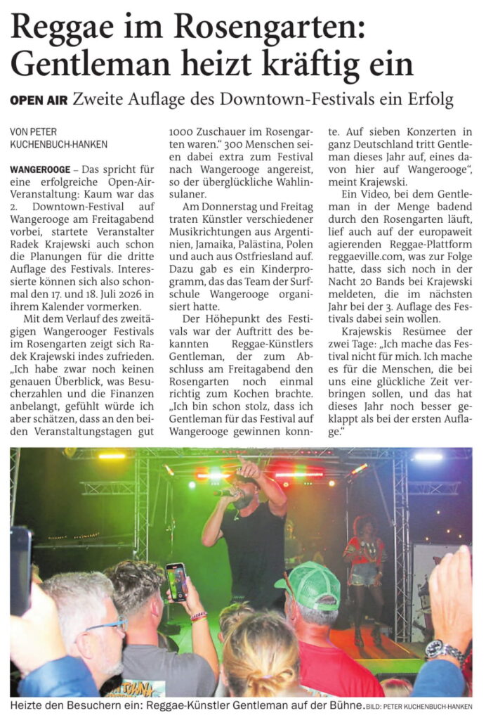 Jeversches Wochenblatt Leute 21.07.2025 Jeversches Wochenblatt – Reggae im Rosengarten: Gentleman heizt kräftig ein 20. Juli 202520. Juli 2025 peter Post Views: 298