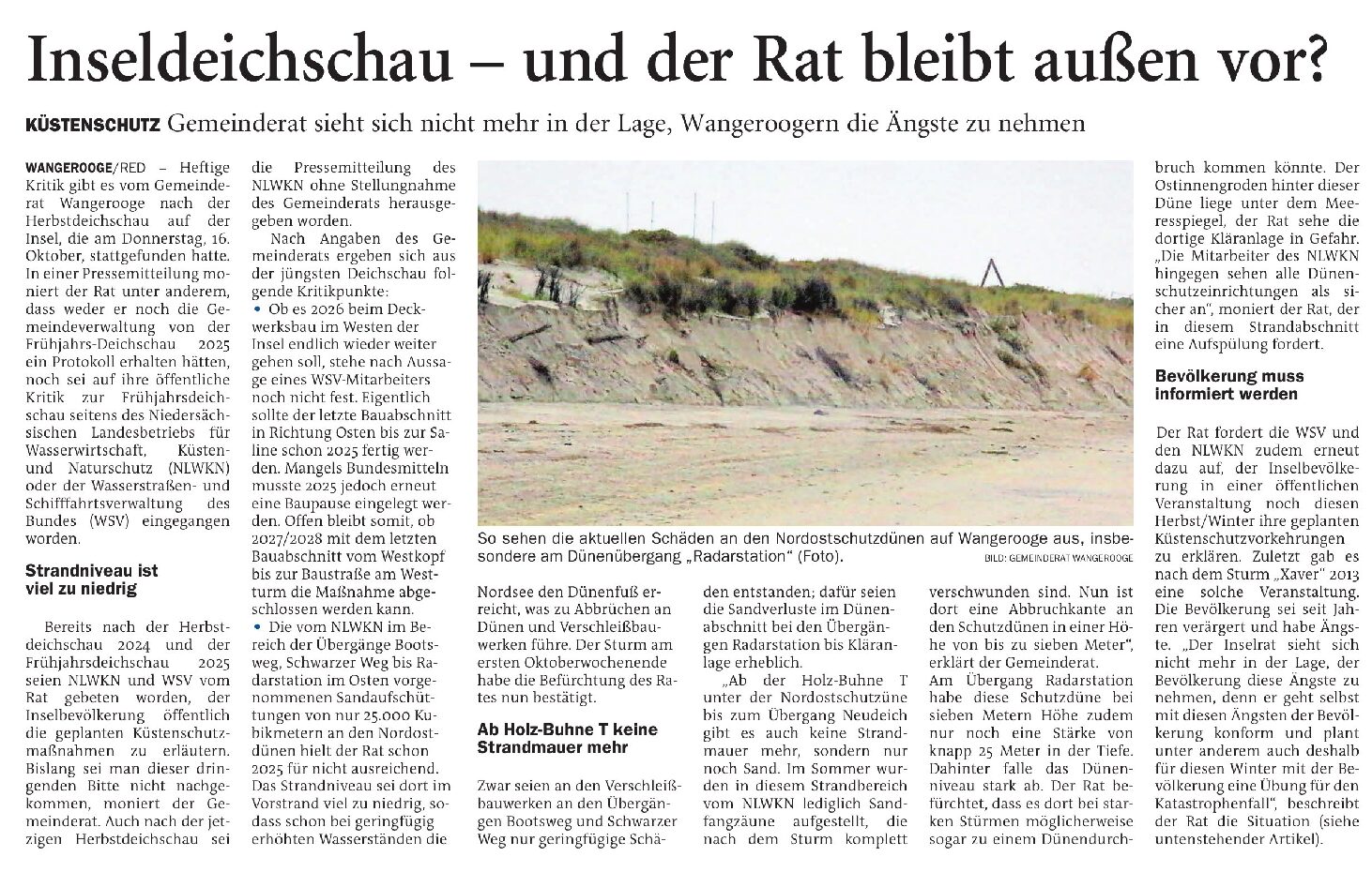 Aktuelles Leute Politik See 21.10.2025 Jeversches Wochenblatt – Inseldeichschau – und der Rat bleibt außen vor? 21. Oktober 202521. Oktober 2025 peter 21.10.2025 Jeversches Wochenblatt - Inseldeichschau - und der Rat bleibt außen vor? Post Views: 56