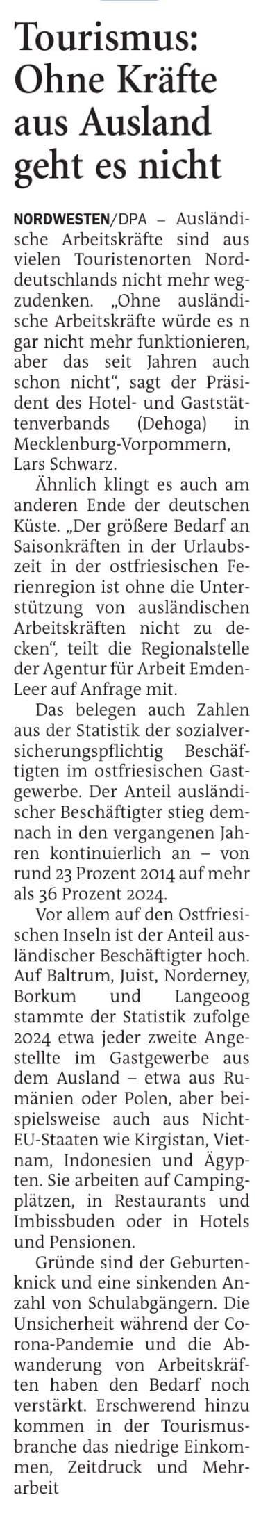 Jeversches Wochenblatt Leute Politik 22.07.2025 Jeversches Wochenblatt – Tourismus: Ohne Kräfte aus Ausland geht es nicht 21. Juli 202521. Juli 2025 peter Post Views: 225