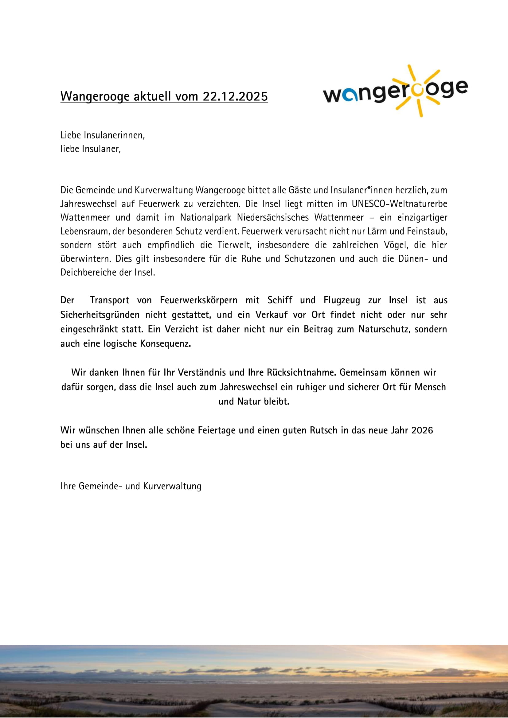 Aktuelles Leute Natur Politik See 22.12.2025 Gemeinde- und Kurverwaltung bittet alle Gäste und Insulaner*innen zum Jahreswechsel auf Feuerwerk zu verzichten 22. Dezember 202522. Dezember 2025 peter 22.12.2025 Gemeinde und Kurverwaltung Wangerooge bittet alle Gäste und Insulaner*innen herzlich, zum Jahreswechsel auf Feuerwerk zu verzichten Post Views: 482