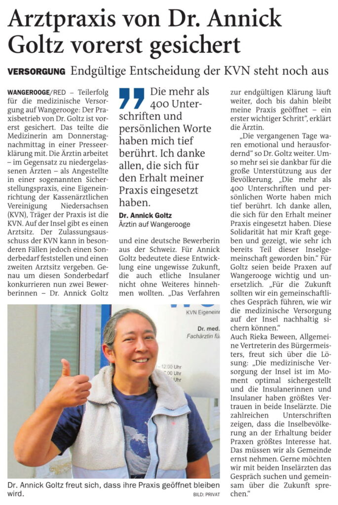 23.08.2025 Jeversches Wochenblatt – Arztpraxis von Dr. Annick Goltz vorerst gesichert