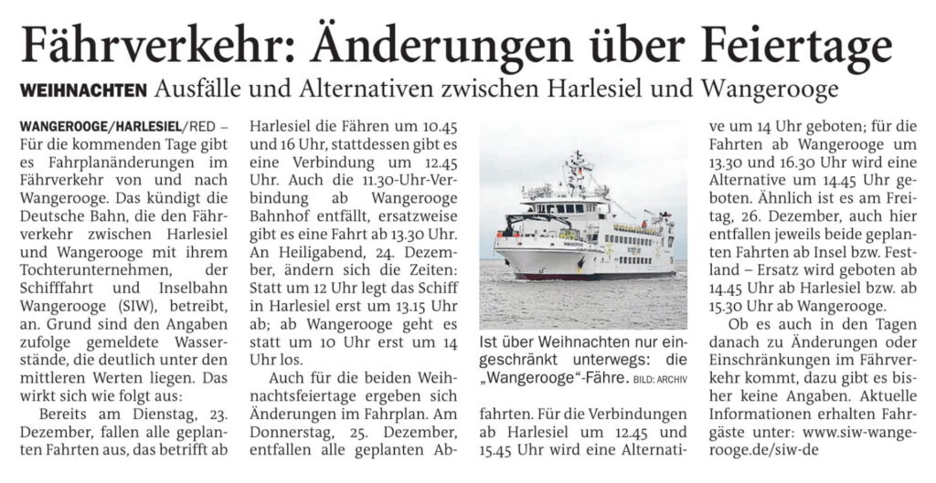 Jeversches Wochenblatt Leute See 23.12.2025 Jeversches Wochenblatt – Fährverkehr: Änderungen über Feiertage 22. Dezember 202522. Dezember 2025 peter Post Views: 403