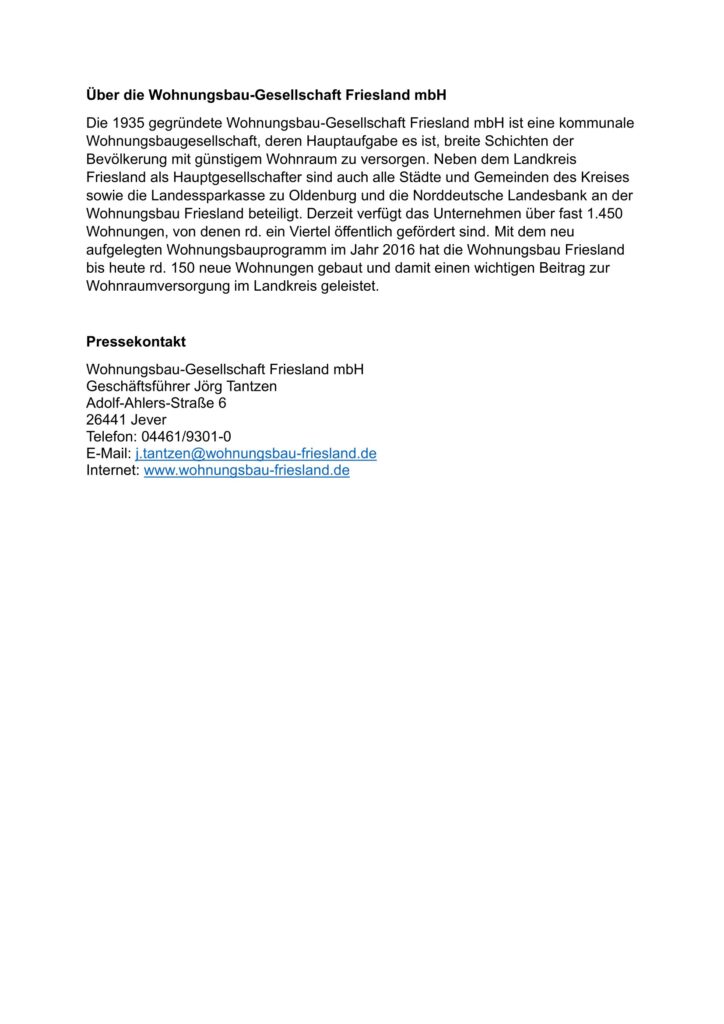 Bezahlbarer Wohnungsbau auf Wangerooge ist extrem wichtig. Deshalb freue ich mich, dass wir heute einen Neubau auf der Insel richten konnten: Mit dem Neubau in der Siedlerstraße 39d errichtet die Wohnungsbau Friesland einen Zwillingsbau neben dem bereits 2021 ebenfalls von der Wohnungsbau Friesland gebauten Mehrfamilienhaus. Da das erste Haus sehr gut angenommen wurde, hatte die Inselgemeinde Wangerooge die Wohnungsbau Friesland gebeten, auf dem Nachbargrundstück, welches bisher mit einem alten Barackengebäude bebaut war, den gleichen Haustyp zu realisieren. Im Zuge dieses Neubaus ist die Inselgemeinde auch im vergangenen Jahr Gesellschafter der Wohnungsbau Friesland geworden und hat das Grundstück in der Siedlerstraße in die Gesellschaft eingebracht. Somit sind 90 Jahre nach der Gründung alle Gemeinden und Städte des Landkreises Friesland Gesellschafter der Wohnungsbau Friesland. Der Aufsichtsrat der Wohnungsbau Friesland unter der Führung seines Vorsitzenden Landrat Sven Ambrosy haben zudem weitere Neubauvorhaben für die kommenden Jahre beschlossen. Somit wird ein weiterer Beitrag zur Wohnraumversorgung und bezahlbarer Mieten für die Menschen im Landkreis Friesland geleistet. Der Haustyp, der jetzt in der Siedlerstraße gebaut wird, wurde das erste Mal auf Wangerooge von der Wohnungsbau Friesland gebaut, und wird intern deshalb gerne als Typ „Wangerooge“ bezeichnet. Dieser Haustyp erfreut sich bei den Mieterinnen und Mietern großer Beliebtheit. Jeweils fünf Wohnungen sind 50 und 63 m² groß und verfügen auch jeweils über einen Balkon. Das Dach wird mit einer Photovoltaikanlage versehen, so dass die Mieter auch von einem günstigen Mieterstrommodell profitieren können. Die Beheizung der neuen Häuser erfolgt nach neuestem Standard über zentrale Wärmepumpen. Mit dem Neubau in der Siedlerstraße 39d errichtet die Wohnungsbau Friesland einen Zwillingsbau neben dem bereits 2021 ebenfalls von der Wohnungsbau Friesland gebauten Mehrfamilienhaus. Da das erste Haus sehr gut angenommen wurde, hatte die Inselgemeinde Wangerooge die Wohnungsbau Friesland gebeten, auf dem Nachbargrundstück, welches bisher mit einem alten Barackengebäude bebaut war, den gleichen Haustyp zu realisieren. Im Zuge dieses Neubaus ist die Inselgemeinde auch im vergangenen Jahr Gesellschafter der Wohnungsbau Friesland geworden und hat das Grundstück in der Siedlerstraße in die Gesellschaft eingebracht. Somit sind 90 Jahre nach der Gründung alle Gemeinden und Städte des Landkreises Friesland Gesellschafter der Wohnungsbau Friesland. Der Aufsichtsrat der Wohnungsbau Friesland unter der Leitung seines Vorsitzenden Landrat Sven Ambrosy haben zudem weitere Neubauvorhaben für die kommenden Jahre beschlossen. Somit wird ein weiterer Beitrag zur Wohnraumversorgung und bezahlbarer Mieten für die Menschen im Landkreis Friesland geleistet. Der Haustyp, der jetzt in der Siedlerstraße gebaut wird, wurde das erste Mal auf Wangerooge von der Wohnungsbau Friesland gebaut, und wird intern deshalb als Typ „Wangerooge“ bezeichnet. Dieser Haustyp erfreut sich bei den Mieterinnen und Mietern großer Beliebtheit. Jeweils fünf Wohnungen sind 50 und 63 m² groß und verfügen auch jeweils über einen Balkon. Das Dach wird mit einer Photovoltaikanlage versehen, so dass die Mieter auch von einem günstigen Mieterstrommodell profitieren können. Die Beheizung der neuen Häuser erfolgt nach neuestem Standard über zentrale Wärmepumpen. Entscheidend für die wirtschaftliche Umsetzung des Neubauvorhabens ist die öffentliche Förderung durch die NBank, der niedersächsischen Förderbank. Die Wohnungen sind für Haushalte mit mittleren Einkommen bestimmt, die Anrecht auf einen Wohnberechtigungsschein haben. Dank einer speziellen Förderung für die Inseln des Landes Niedersachsens können diese Neubauwohnungen daher für den günstigen Mietpreis von 10,- €/m² angeboten werden. (Quelle: Pressemeldung der Wohnungsbau Friesland vom 24.3.2025)