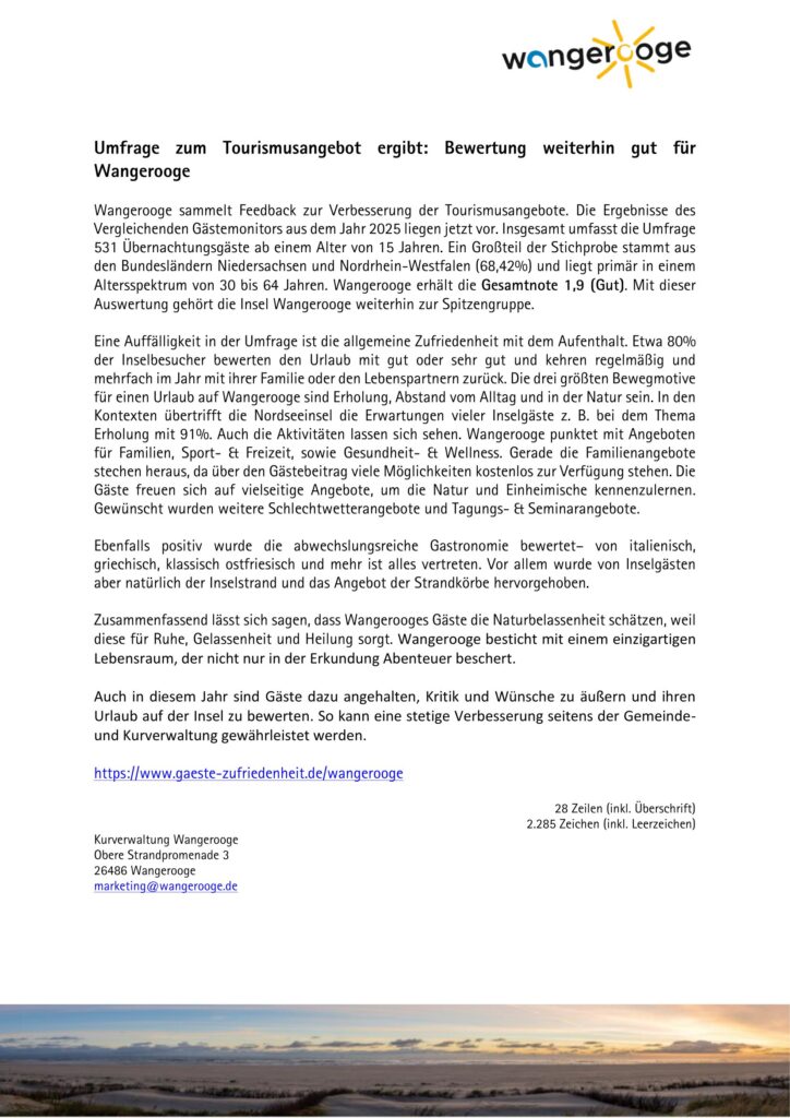 • 24.03.2026 Umfrage zum Tourismusangebot ergibt: Bewertung weitzerhin gut für Wangerooge