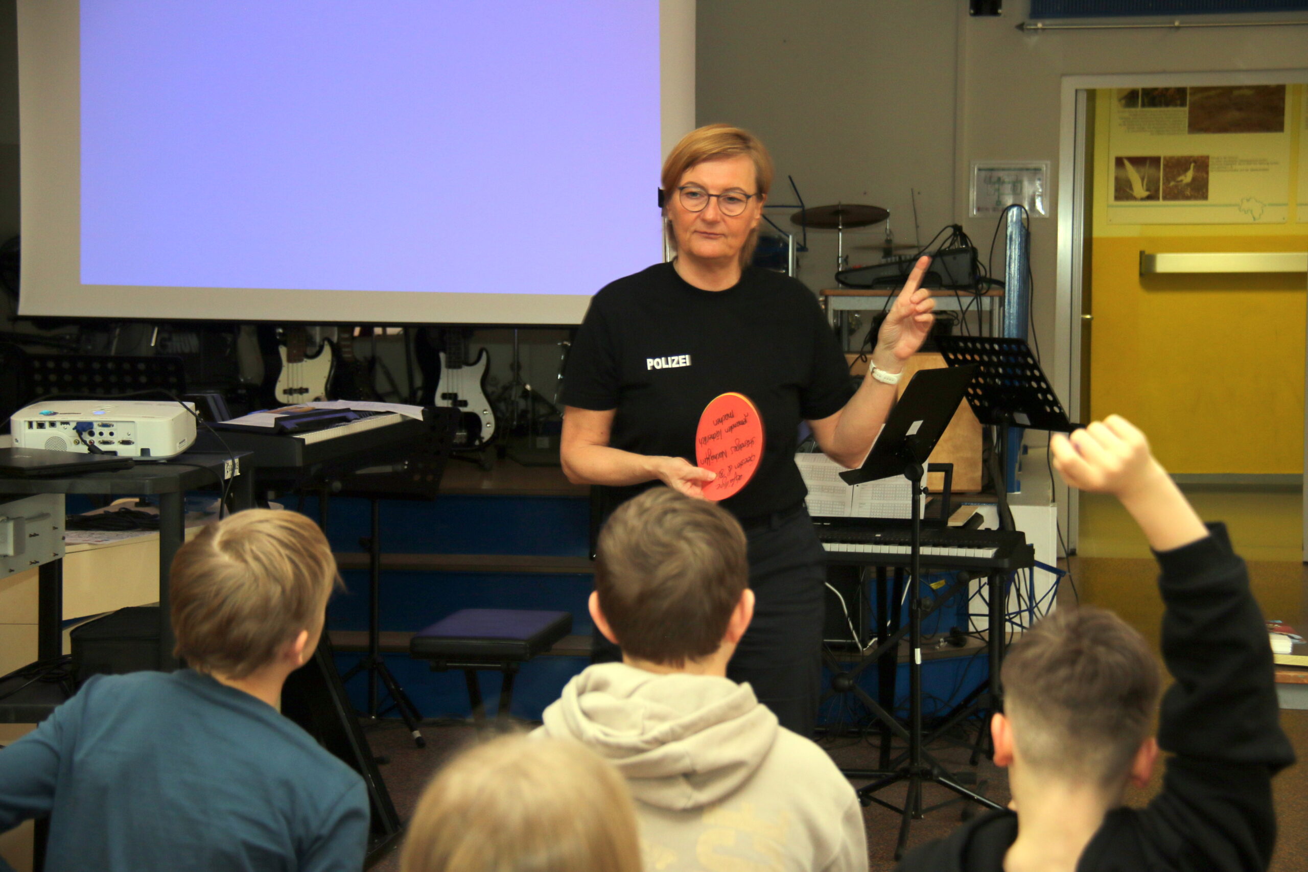 Polizeihauptkommissarin Anja Kienetz mit Schülern in der Pausenhalle der Inselschule Wangerooge.