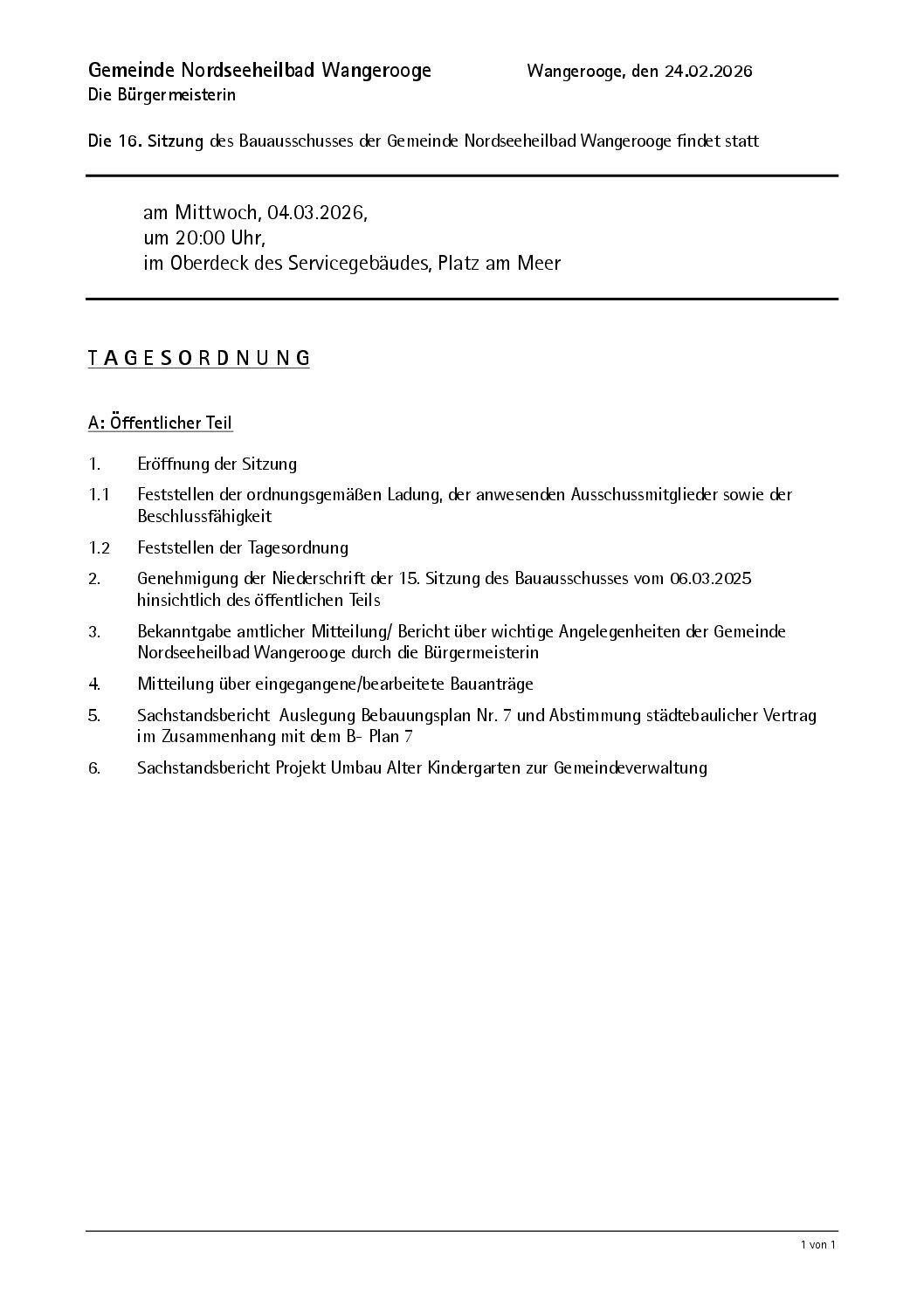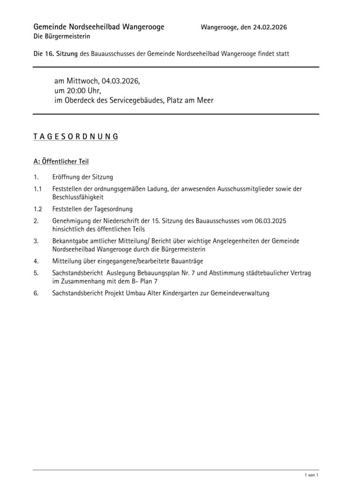 25.02.2026 Einladung Bauausschuss Montag, den 02.03.2026 – 20.00 Uhr Oberdeck am Platz am Meer