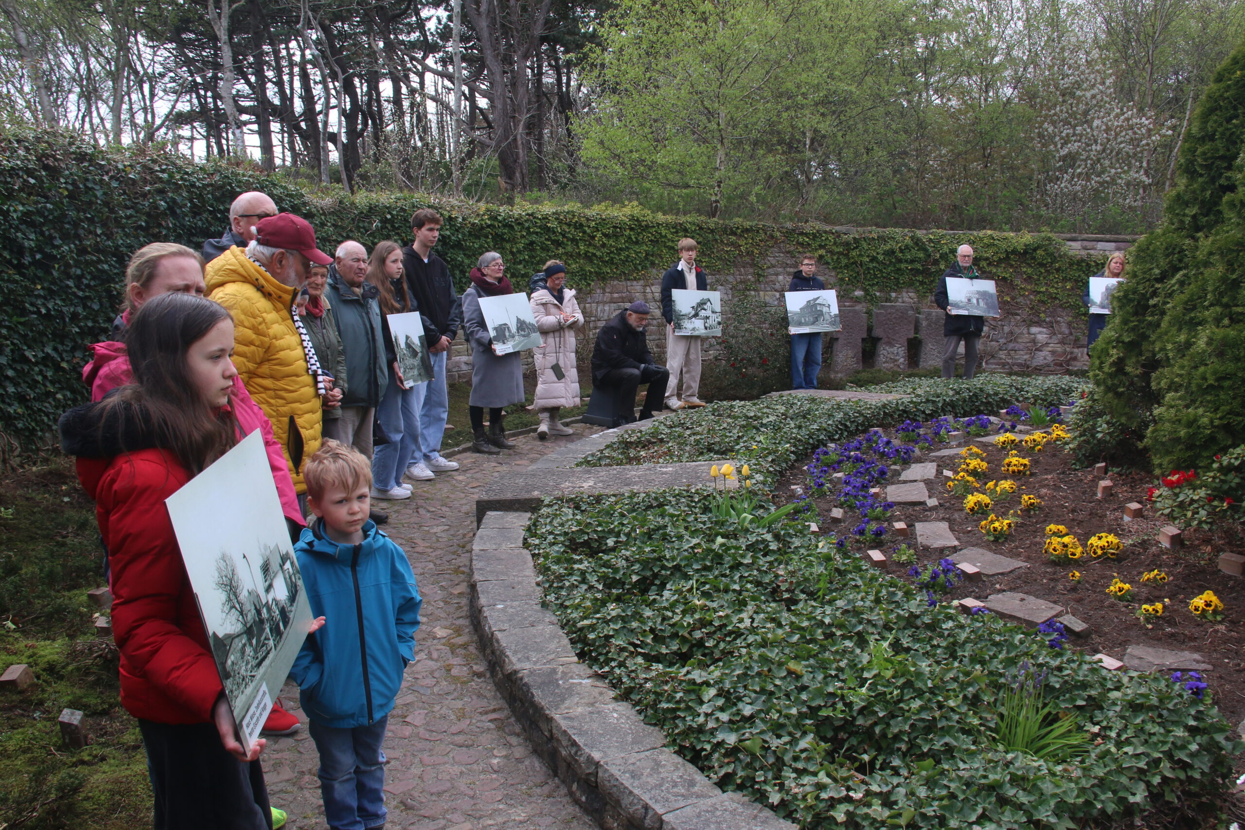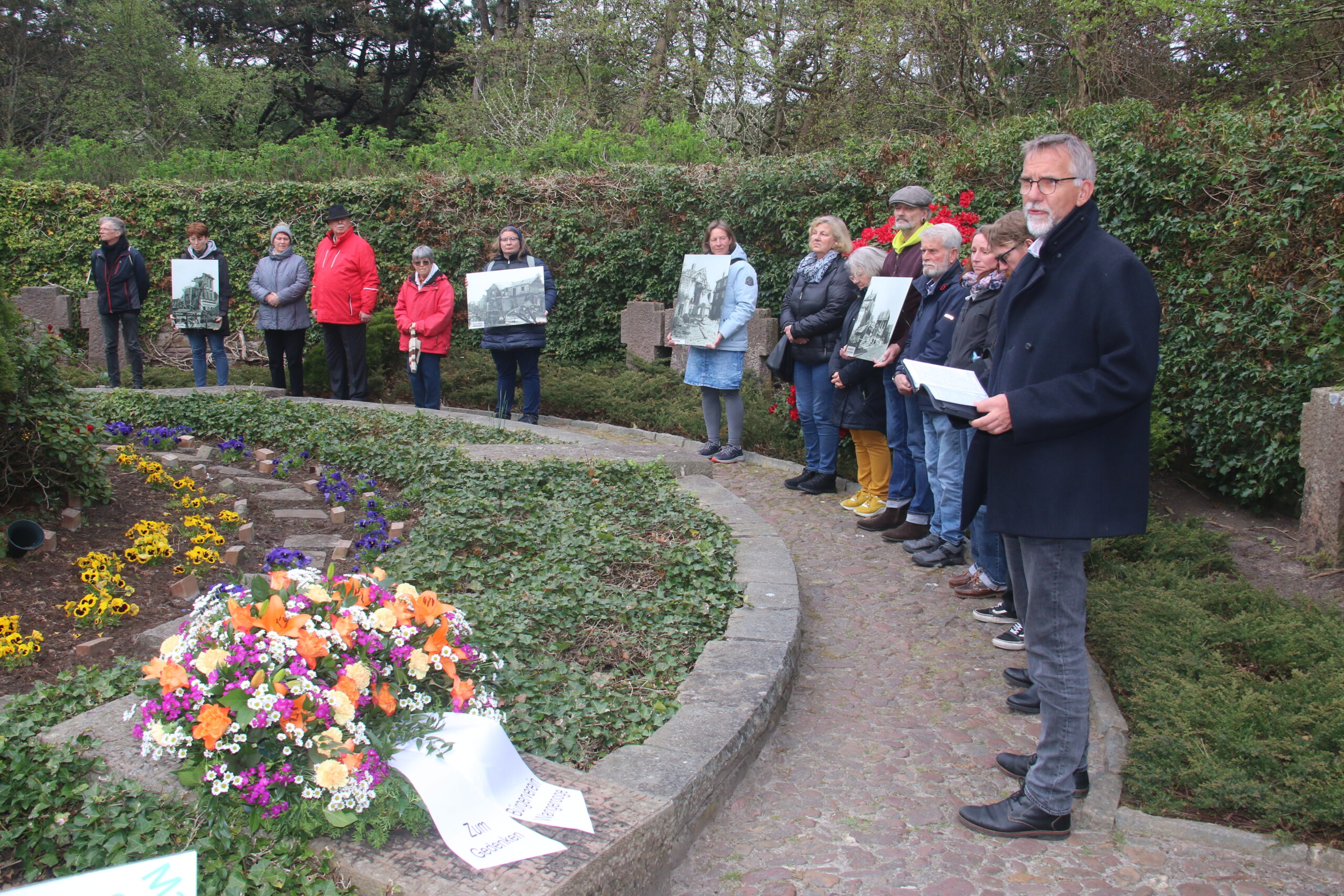 Pastor Jan Janssen spricht ein paar Worte – Anwesende halten Fotos der damals zerstörten Häuser aus der Ausstellung aus dem Kleinen Kursaal hoch, die noch bis 09.05.25 geöffnet ist.