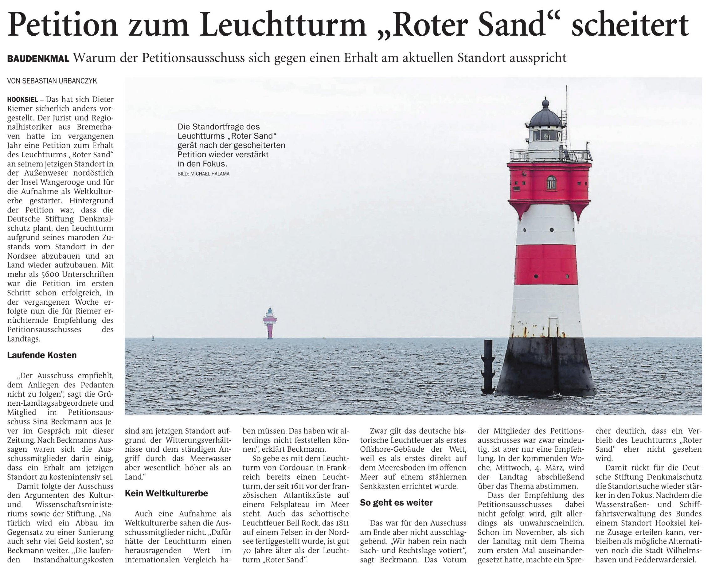 Jeversches Wochenblatt Leute See 27.02.2026 Jeversches Wochenblatt – Petition zum Leuchtturm “Roter Sand” scheitert 26. Februar 202626. Februar 2026 peter Post Views: 5