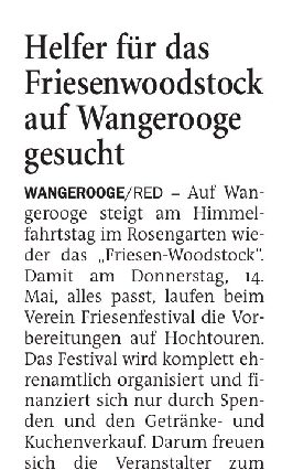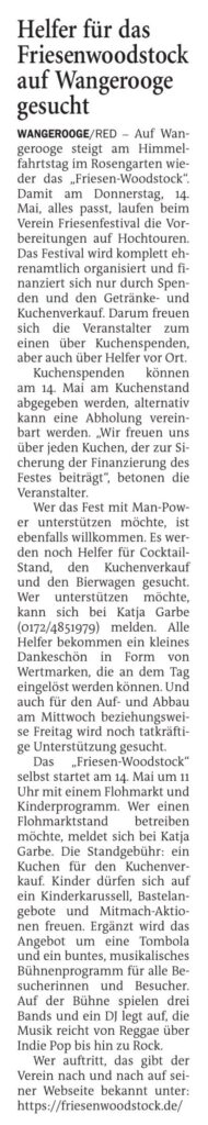 Jeversches Wochenblatt Leute 27.04.2026 Jeversches Wochenblatt – Helfer für das Friesenwoodstock auf Wangerooge gesucht 26. April 202626. April 2026 peter Post Views: 2