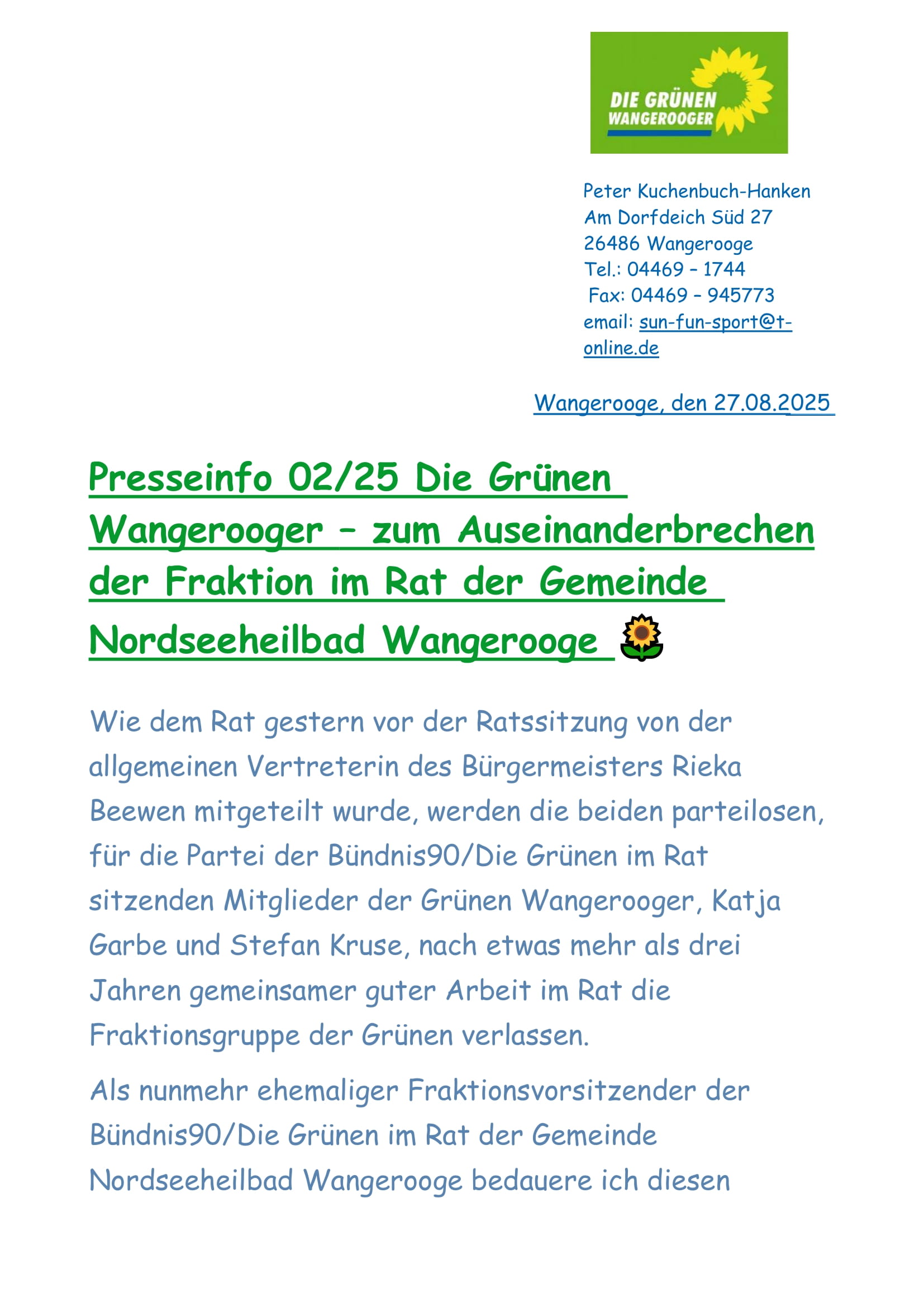 27.08.2025 Pressemitteilung der Grünen Wangerooger zum Auseinanderbrechen der Fraktion im Rat der Gemeinde Nordseeheilbad Wangerooge