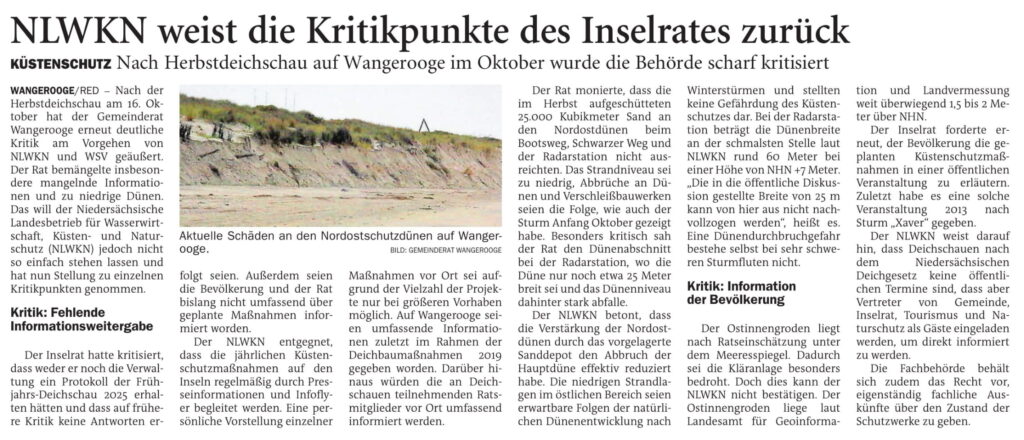 Jeversches Wochenblatt Leute See 27.10.2025 Jeversches Wochenblatt – NLWKN weist die Kritikpunkte des Inselrates zurück 26. Oktober 202526. Oktober 2025 peter Post Views: 2