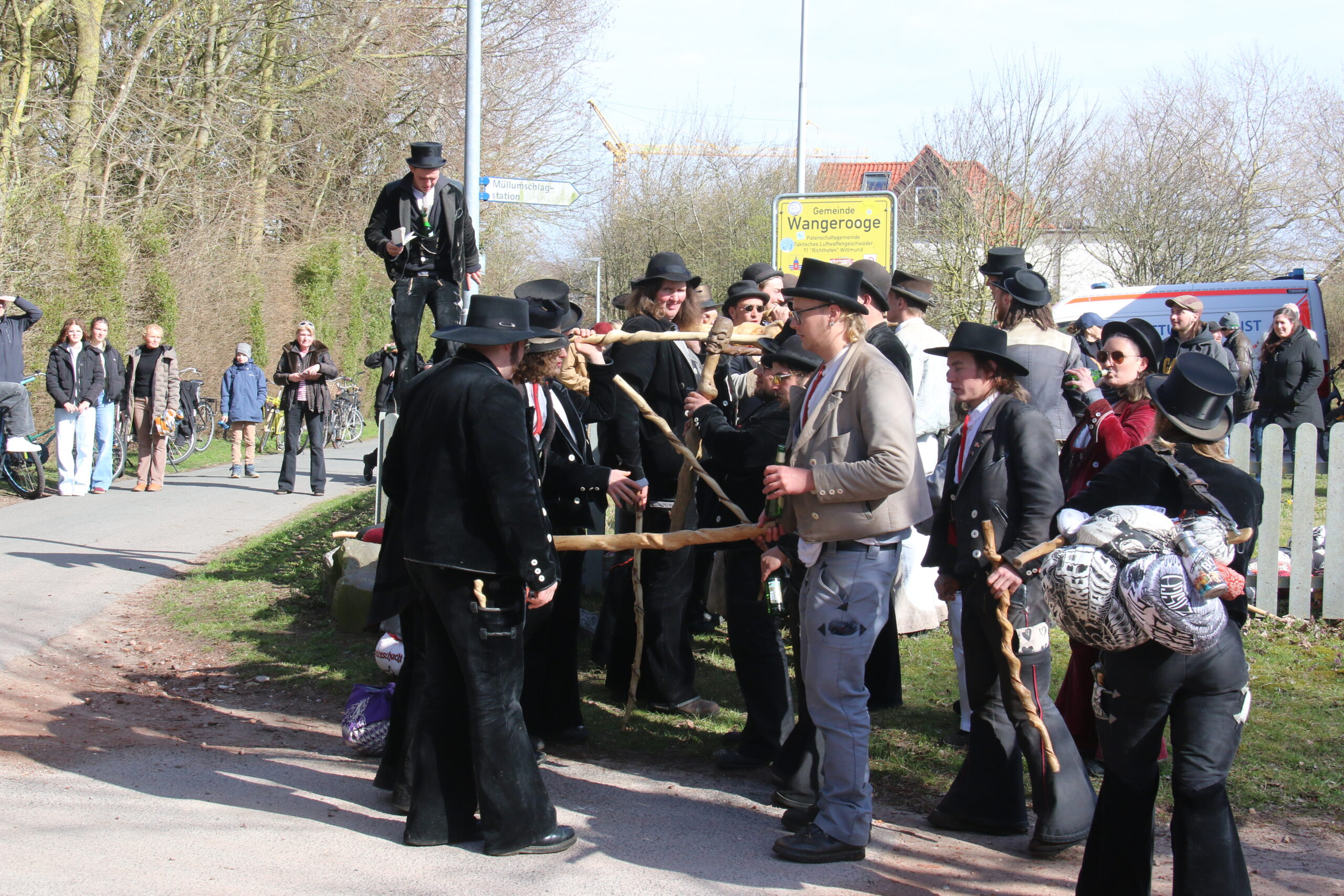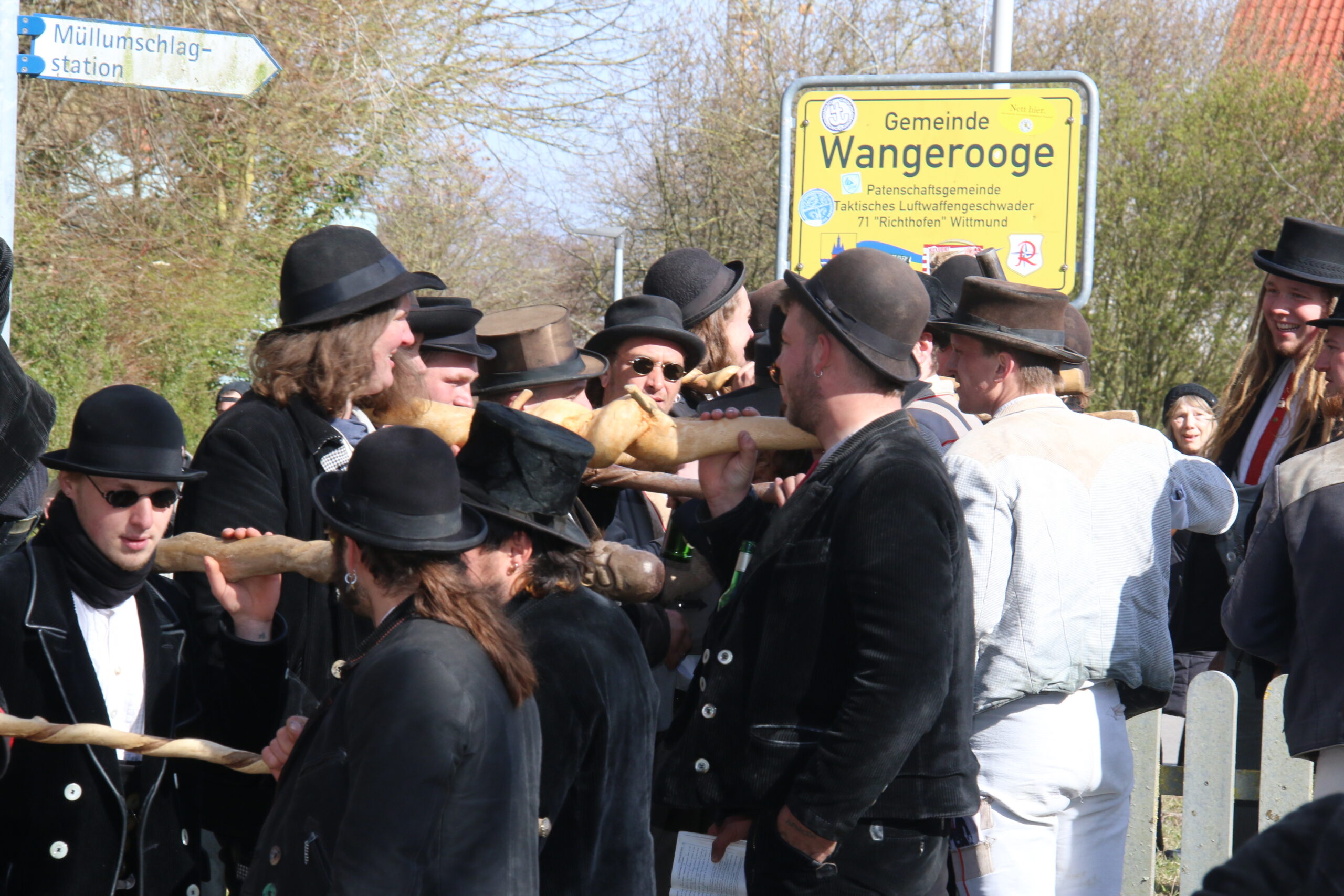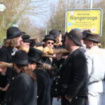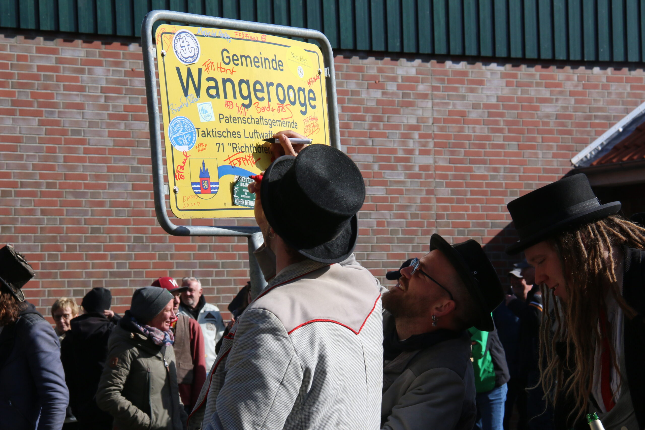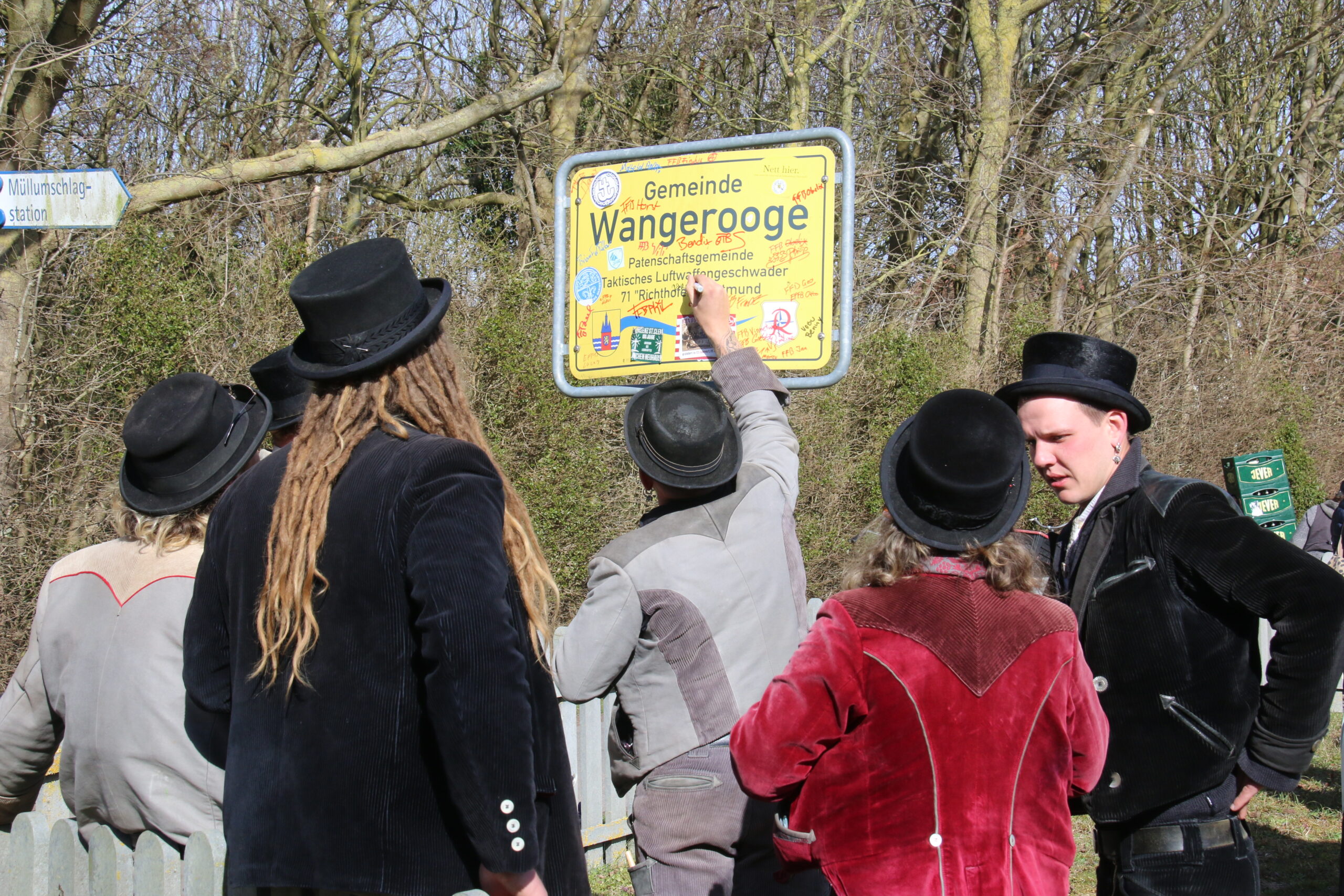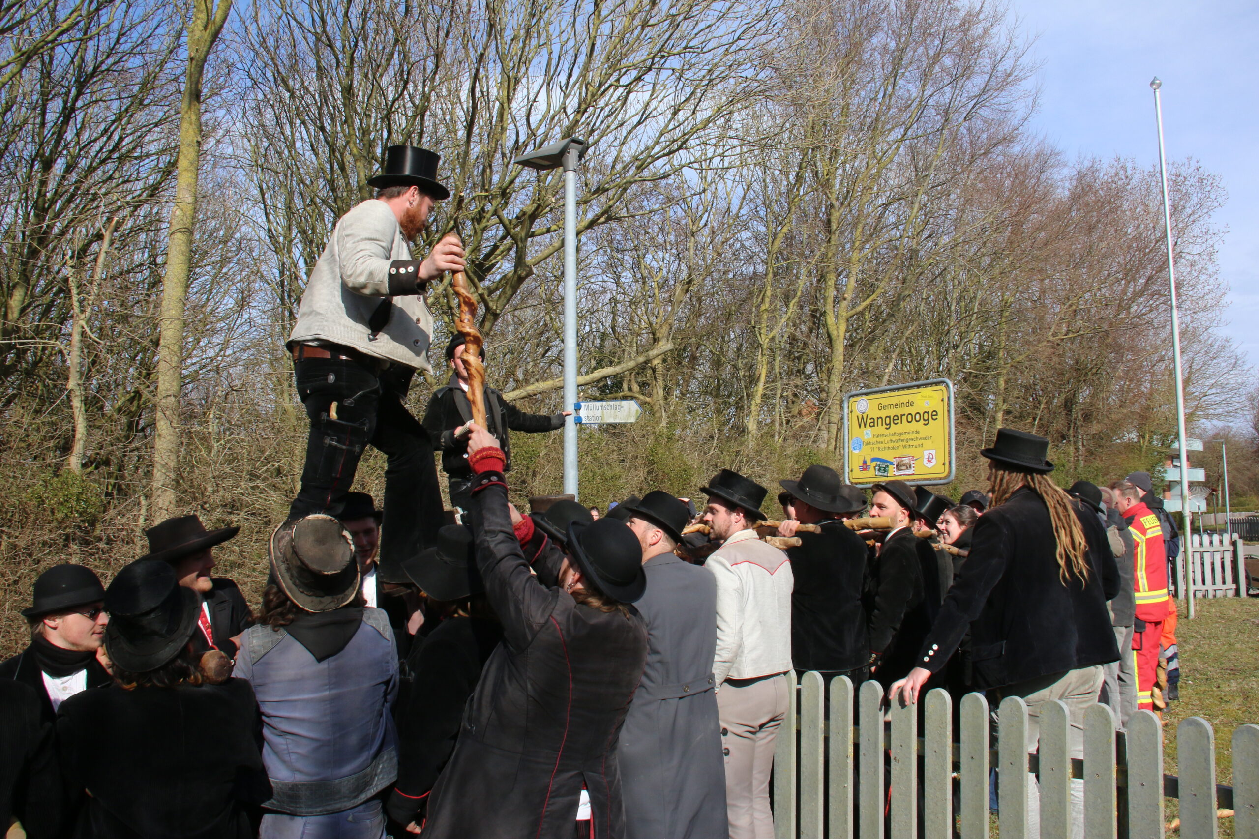 Nach viereinhalb Jahren kehrte der Zimmermannsgeselle Steffen Schrell am Samstag zurück nach Wangerooge. Begleitet wurde er dabei von gut 50 Freunden, seine Wandergesellen. An der Feuerwache an der Straße zum Westen wurde ihm von seiner Familie und Inselfreunden ein Empfang bereitet. Wie es der Brauch der Walz fordert, musste Steffen am Ende seiner langer Wanderschaft, ein Ortsschild am Anfang des Heimatdorfes übersteigen, auf Wangerooge musste dafür das Patenschaftsschild des Richtofengeschwaders herhalten. Seine Wandergesellen bauten ihm dazu eine Treppe aus ihren Wanderstäben, auf der anderen Seite des Schildes bereiteten ihm seine Freunde mit ihren Armen eine weiche Landung.