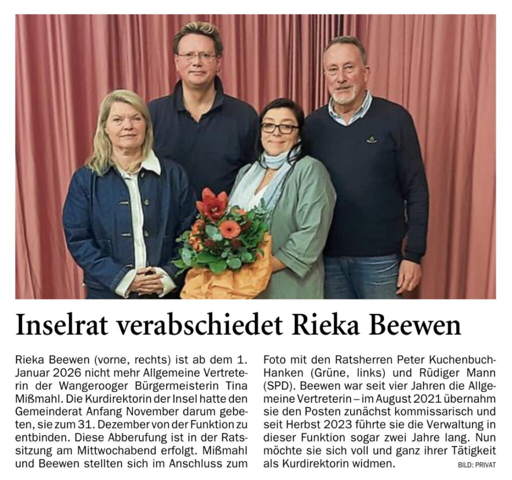 Jeversches Wochenblatt Leute Politik 28.11.2025 Jeversches Wochenblatt – Inselrat verabschiedet Rieka Beewen 27. November 202527. November 2025 peter Post Views: 4