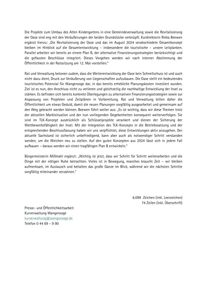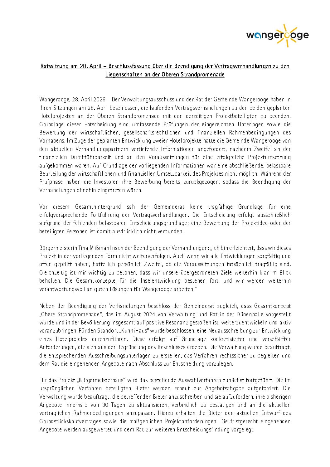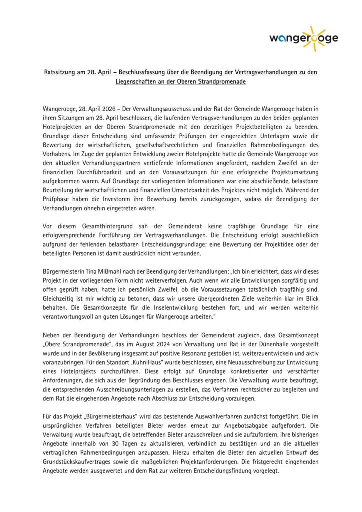 Aktuelles Leute Politik 29.04.2026 Pressemitteilung: Ratssitzung 28.04.2026 – Beschlussfassung über die Beendigung der Vertragsverhandlungen zu den Liegenschaften an der Oberen Strandpromenade 29. April 202629. April 2026 peter Post Views: 3