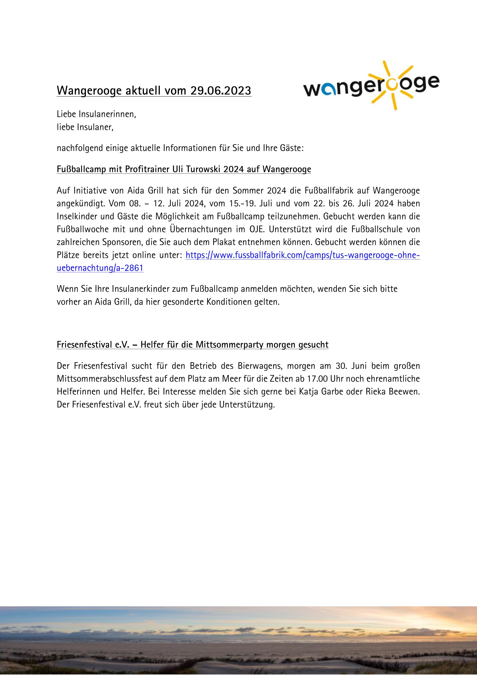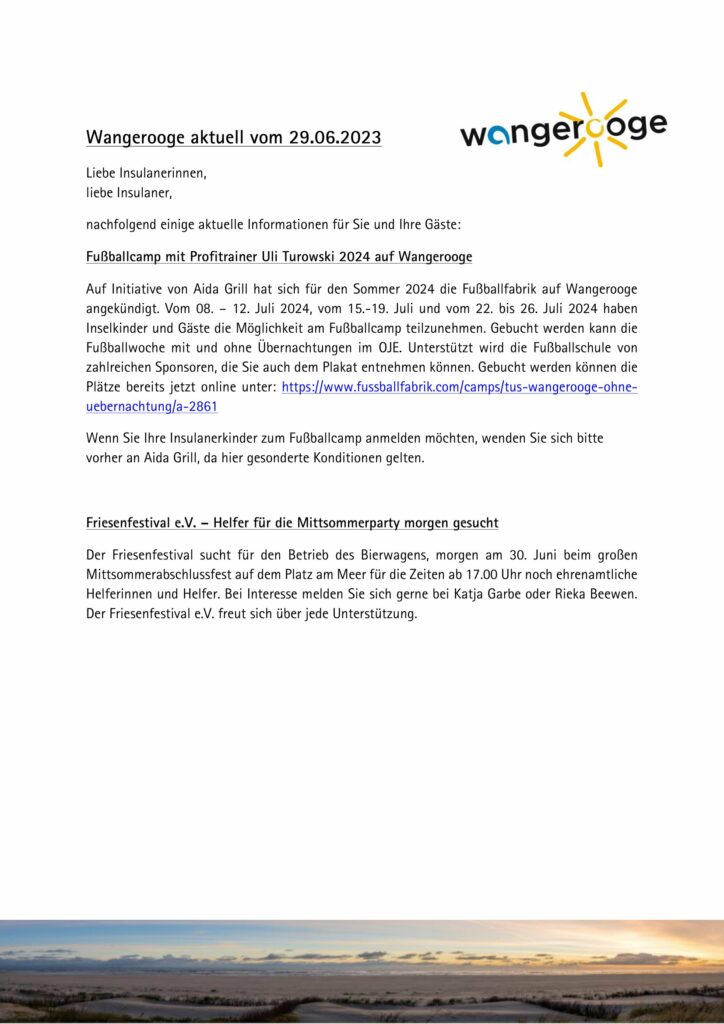 Aktuelles Leute 29.06.2023 Wangerooge Akutell – Fußballcamp und Friesenfestivale.V. sucht Helfer für Mittsommerabschlussfeier 29. Juni 202329. Juni 2023 peter Post Views: 496