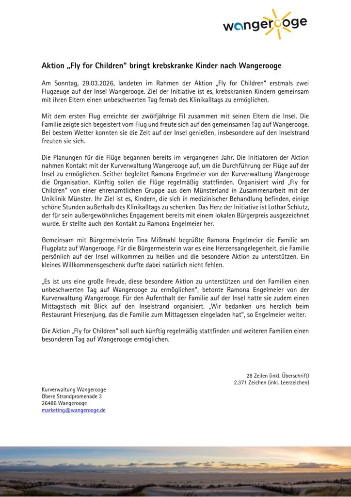30.03.2026 Aktion „Fly for Children“ bringt krebskranke Kinder nach Wangerooge - Aktion am 29.03.2026