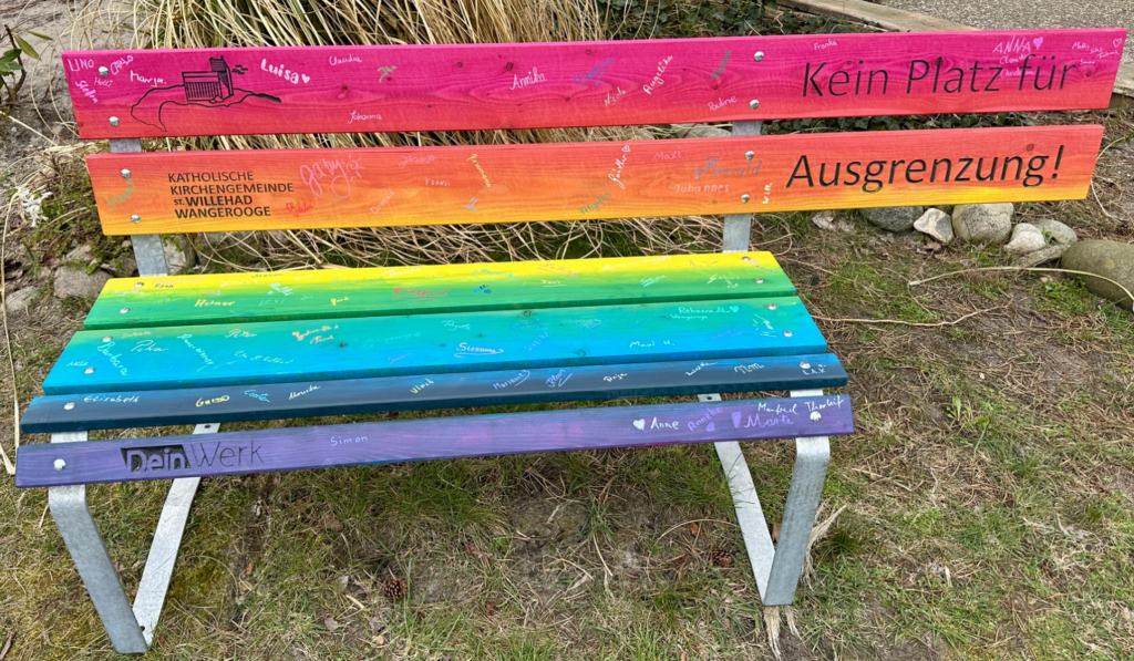 Seit Palmsonntag steht eine Holzbank – in Regenbogenfarben gestrichen – auf dem Kirchplatz der St. Willehad-Gemeinde auf der Insel Wangerooge.