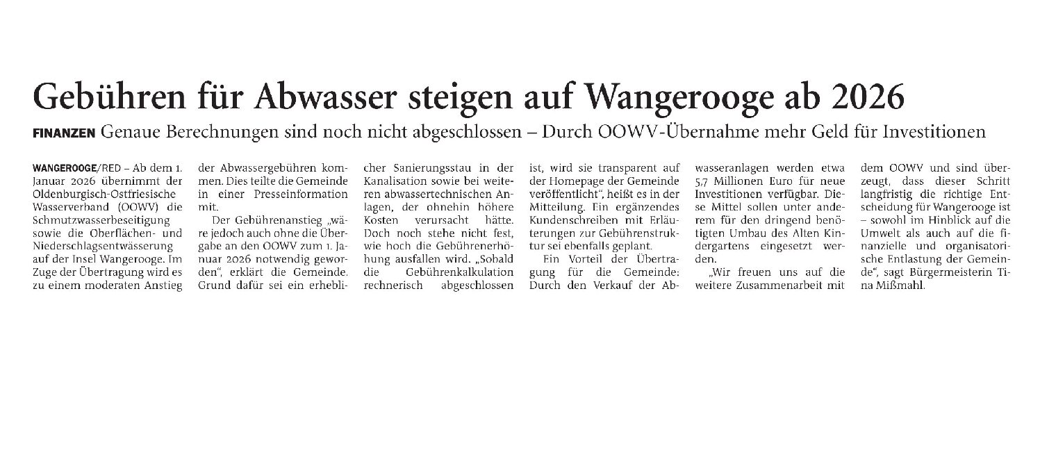 14.11.2025 OOWV übernimmt die Abwasserentsorgung auf Wangerooge – Investitionen und Transparenz im Fokus Post Views: 331