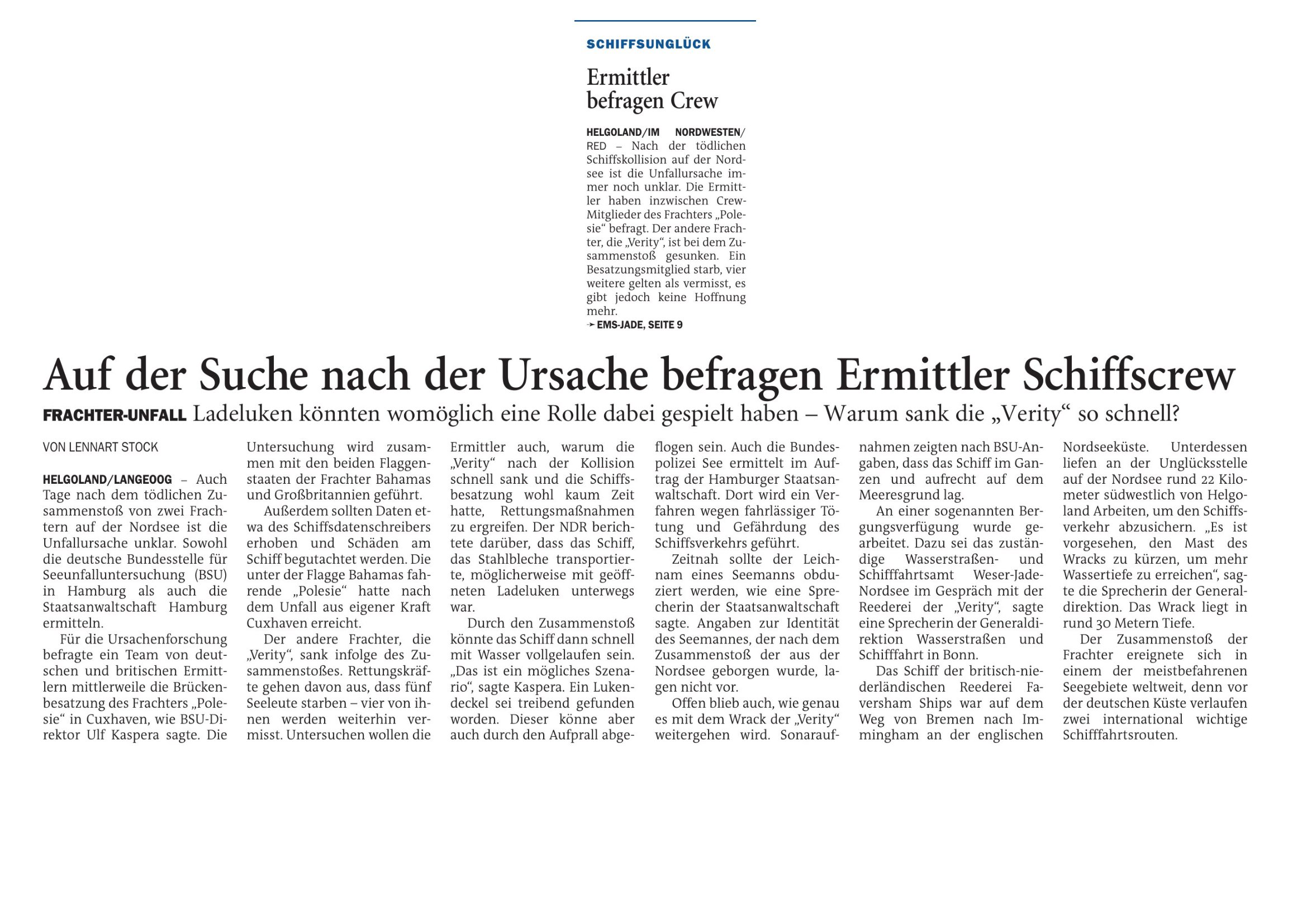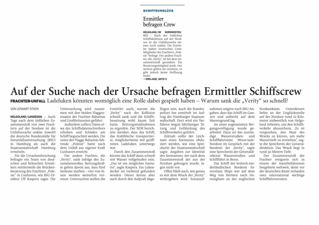 Aktuelles Jeversches Wochenblatt See 28.10.2023 Jeversches Wochenblatt – Auf der Suche nach der Ursache befragen Ermittler Schiffscrew 27. Oktober 202327. Oktober 2023 peter Post Views: 505