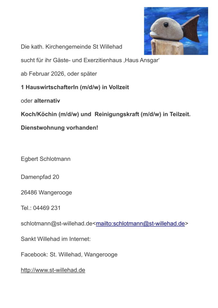 28.01.2026 Stellenanzeige: kath. Kirchengemeinde St Willehad – Gäste- und Exerzitienhaus ‚Haus Ansgar‘ – Hauswirtschafter*in oder Koch/Köchin – und Reinigungskraft – m/w/d
